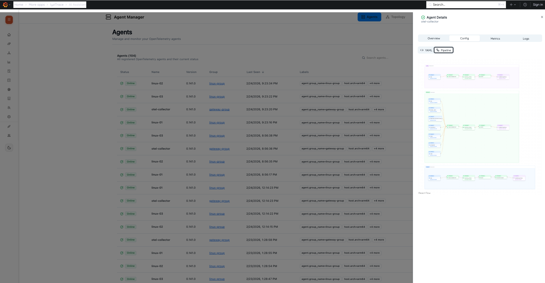 AI-Powered InsightsAgent Fleet Management: Manage and monitor your OpenTelemetry collectors with real-time topology views, configuration management, metrics dashboards, and centralized log collection.
